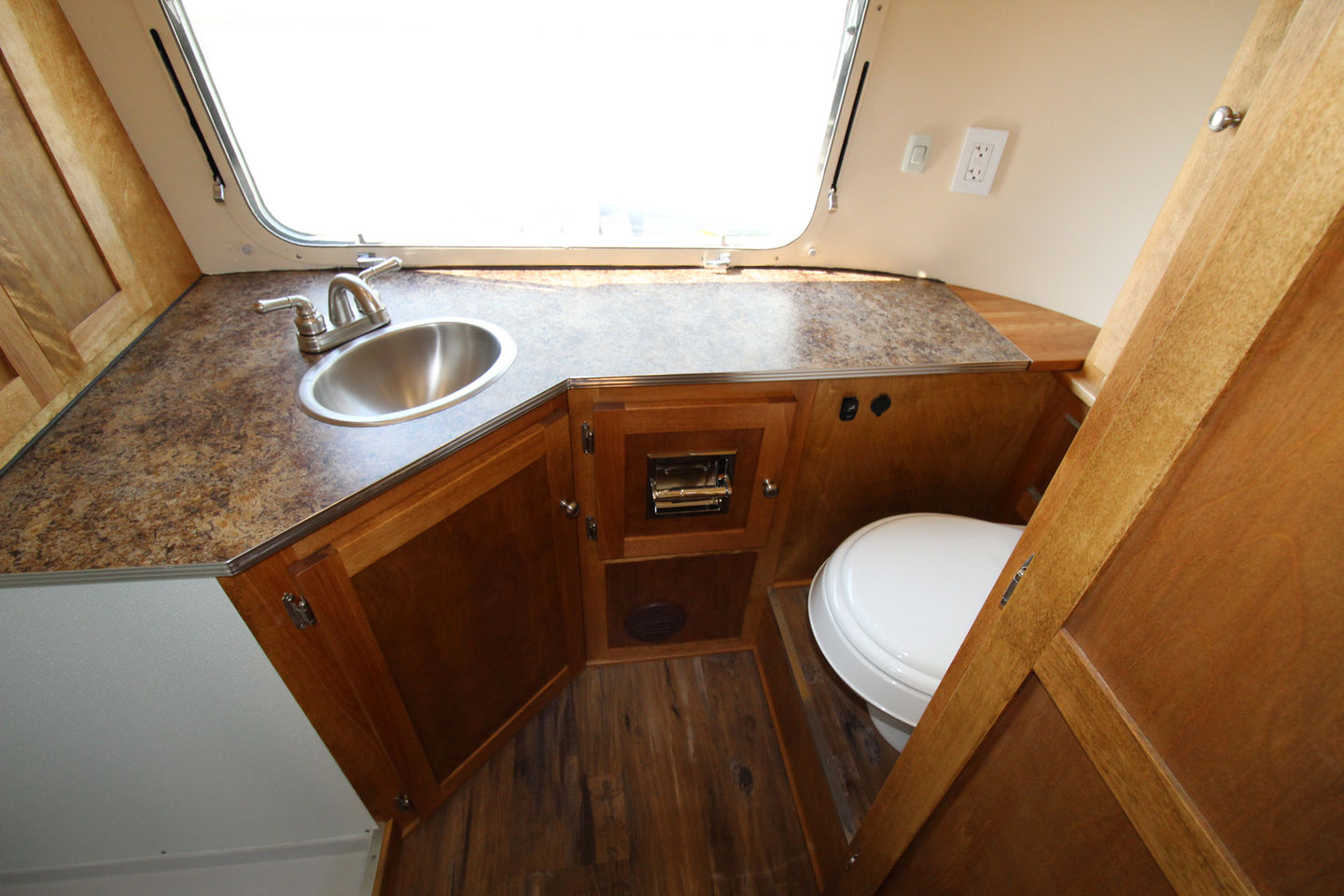 For our clients, avid hunters, we installed rifle and pistol safes, ensuring their gear is as secure as it is accessible. The living essentials were all upgraded: a new air conditioner, a Suburban propane furnace, and a convection microwave enhance the living experience. The floors now boast durable LVT plank flooring, and the trailer is powered by a robust 180-watt Zamp solar system, ensuring off-grid capabilities.