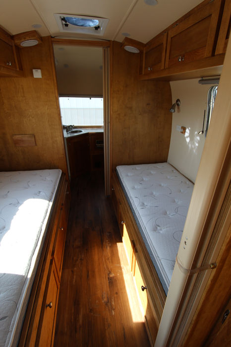 Inside, we brought the Overlander into the 21st century while respecting its roots. The interior was reimagined with beautiful birch and our signature lightweight cabinetry, maintaining the trailer’s original weight—a testament to our meticulous craftsmanship. A pull-out pantry and custom twin mattresses maximize space and comfort.